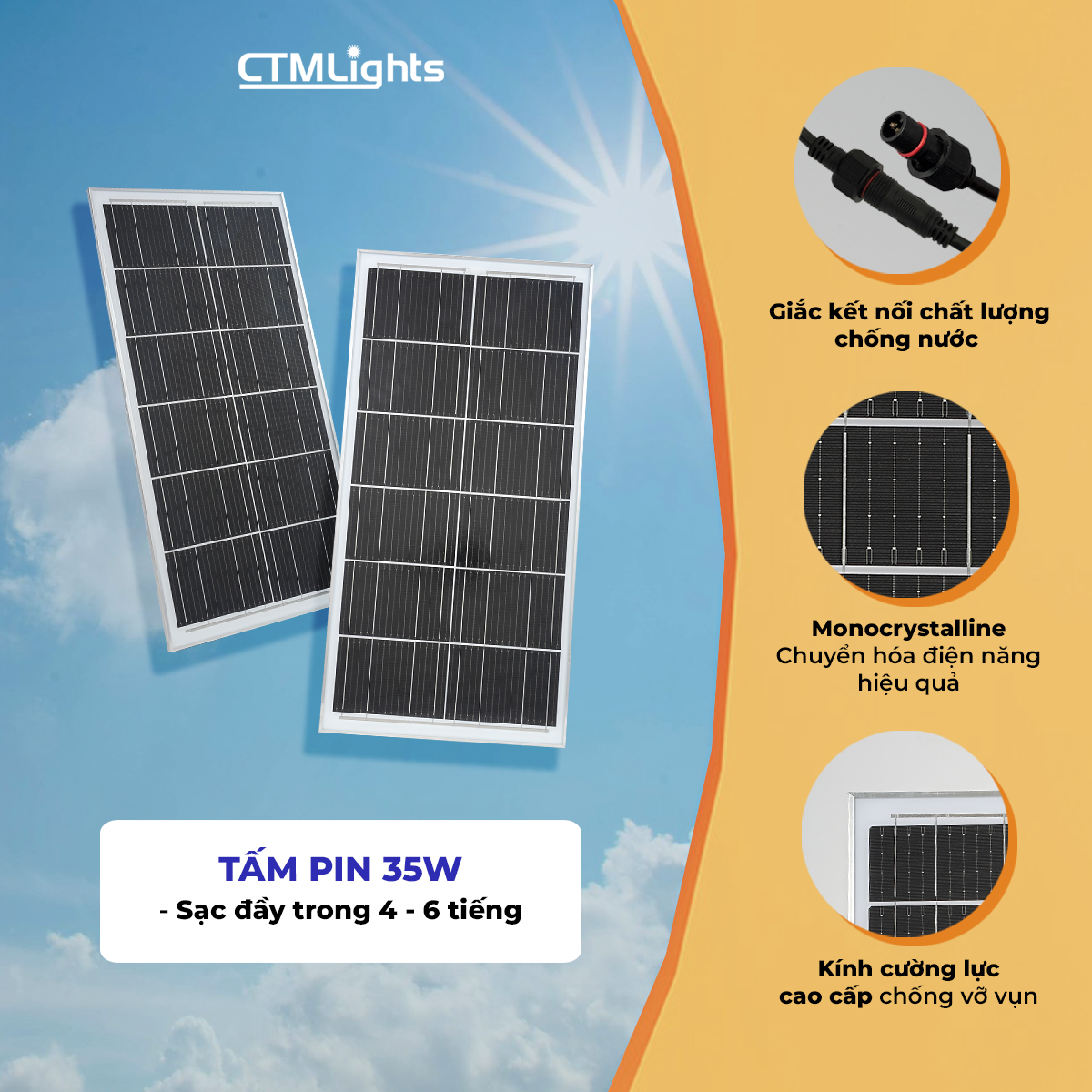- Tấm Pin: Mono hiệu suất quang điện cao 6V/35W