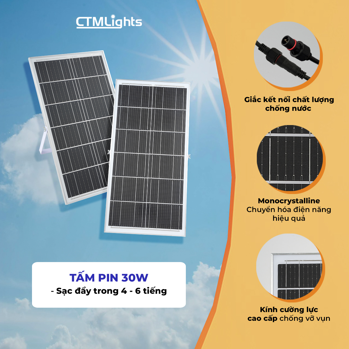 - Tấm Pin: Mono hiệu suất quang điện cao 6V/30W