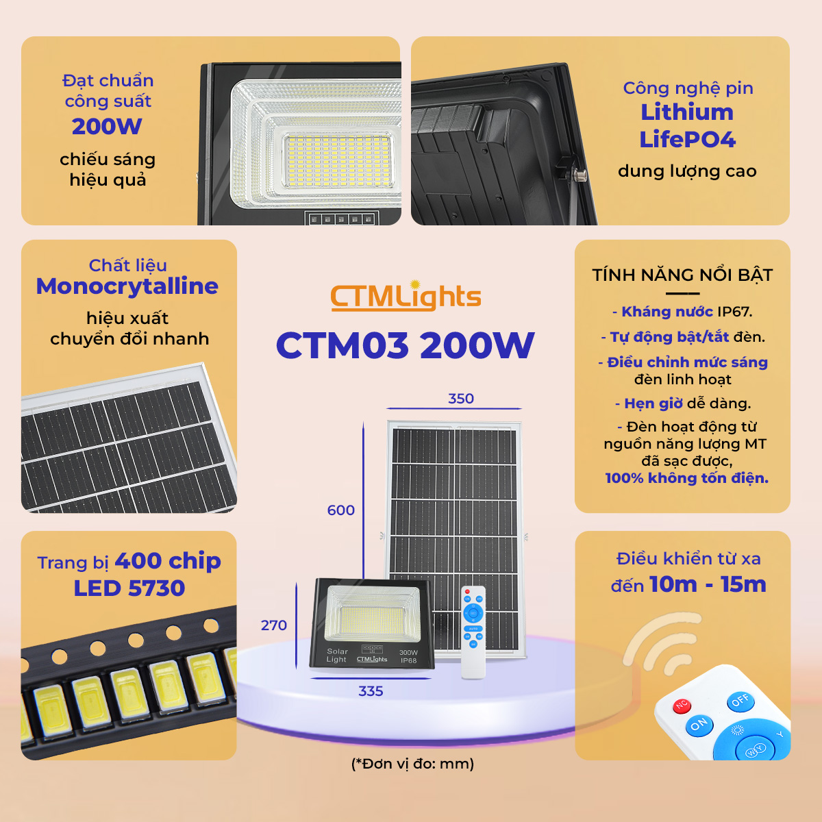- Kích thước đèn: 335x270x80mm