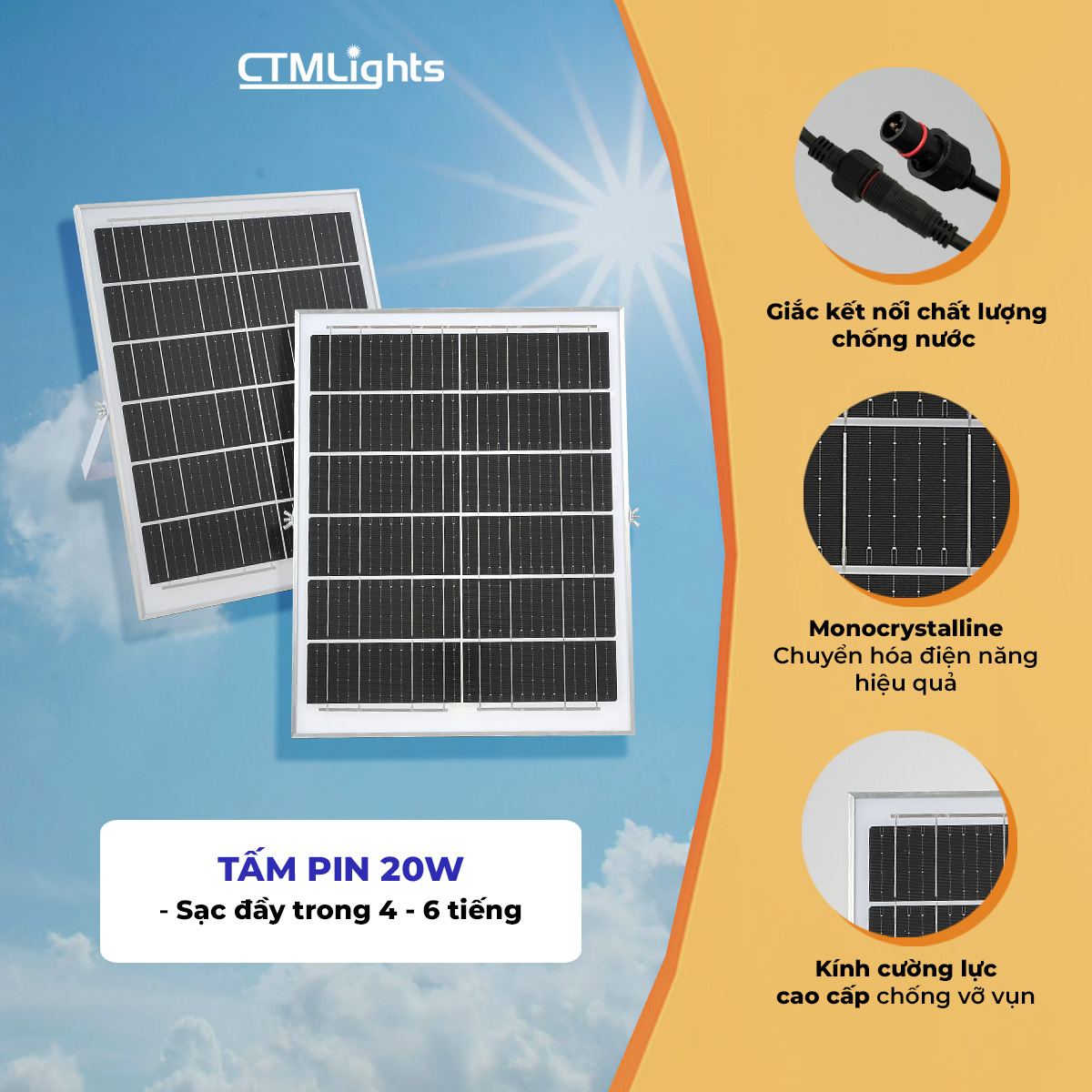 - Tấm Pin: Mono hiệu suất quang điện cao 6V/20W